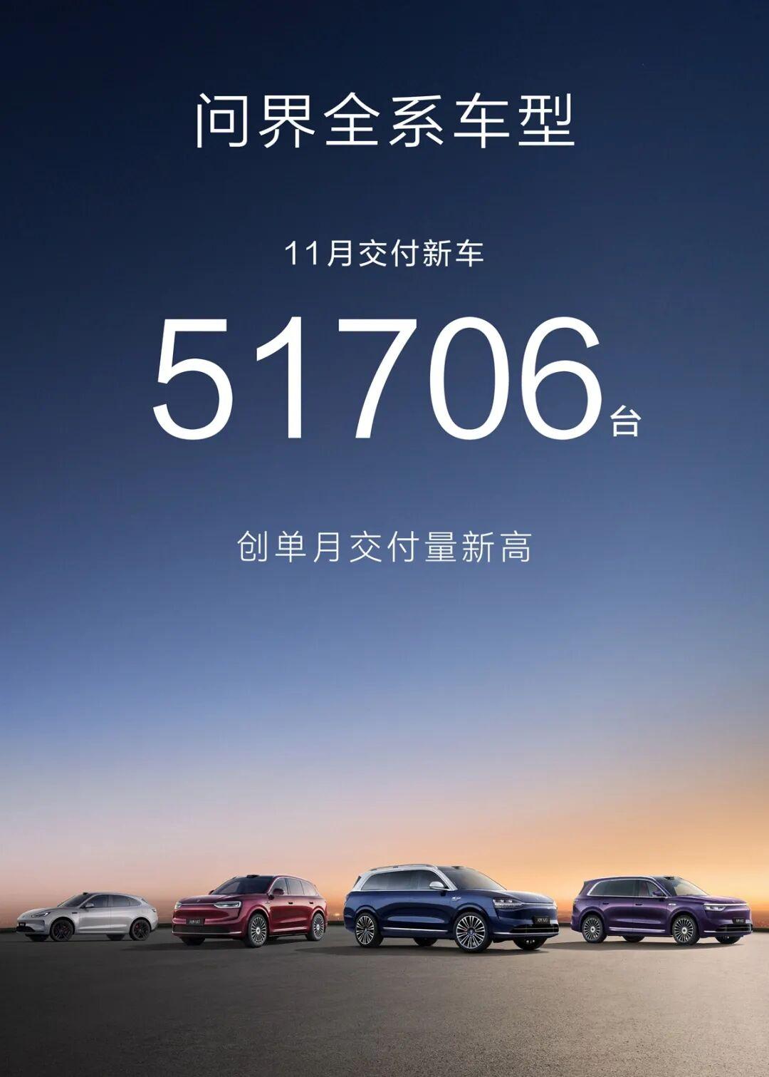 隔了一天,赛力斯官方发布了问界品牌11月的产销快报:问界M5(参数丨图片)/7/8/9四款产品,合计51706辆。