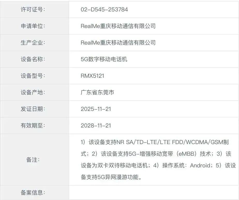 除了定制版新品外,最近的消息还显示,一款型号为RMX5121的真我旗下新机通过了认证。其中没有详细的产品系列信息,但有推测认为其有可能是真我 16 Pro。