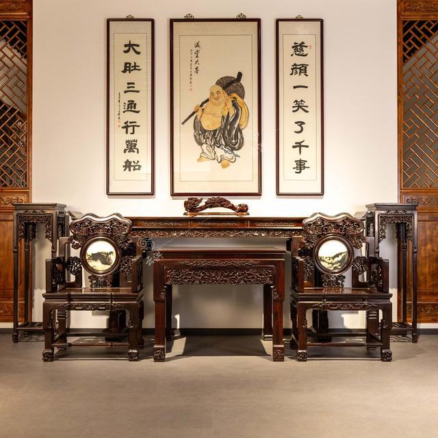 除了待客之外,还可以做礼器、佛堂。中堂,既是重要客人的接待处,也是家庭议事的主要场所,亦是对子孙进行教育立身的地方。可以说,这一套家具,展现中华文化的深厚底蕴。