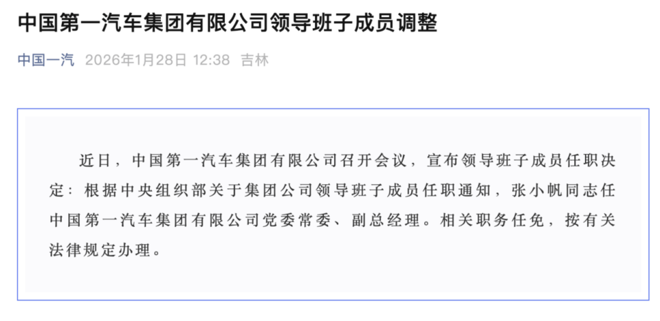 近日,中国第一汽车集团有限公司宣布一项重要人事调整:张小帆出任公司党委常委、副总经理。此项任命系根据中央组织部关于央企领导班子成员的任免通知作出,相关程序将依规履行。