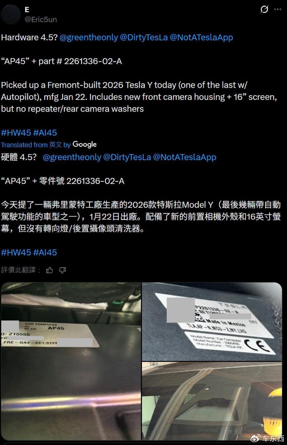 这一发现源于特斯拉车主@Eric5un的爆料。他新提了一辆产自弗里蒙特工厂的2026款Model Y全轮驱动Premium版,并发现新车除换装16英寸中控屏外,手套箱下方还藏着一台部件编号为“2261336-02-A”的辅助驾驶计算机,其机身上醒目的“AP45”标签,直接证实了这便是传闻中的HW4.5硬件。