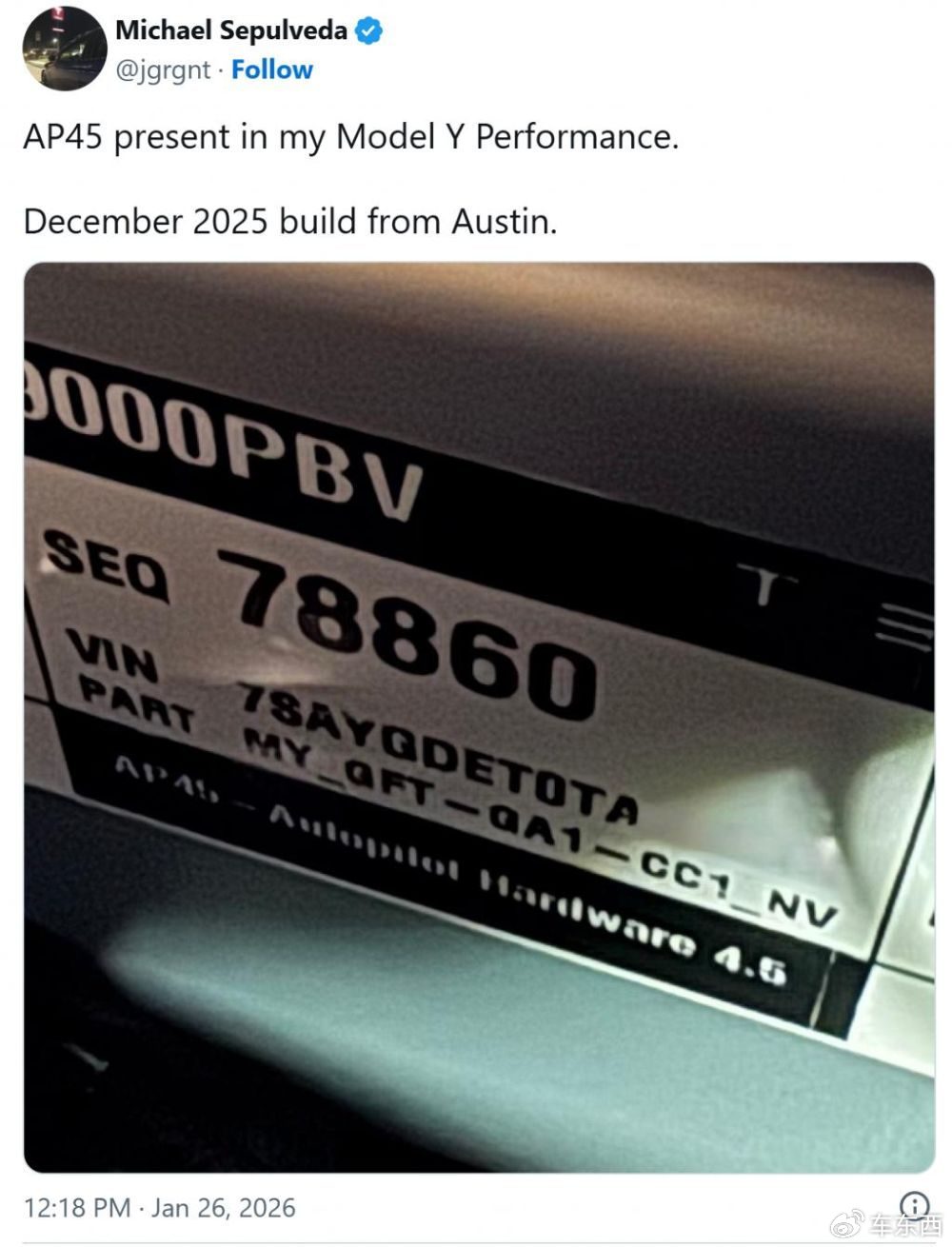 此事件并非个例,另一位从奥斯汀工厂提车的Model Y性能版车主,以及多位在12月提车的车主,也相继晒出了相同的硬件证据。种种迹象表明,尽管特斯拉未正式公布HW4.5,但最新批次的Model Y很可能已开始换装HW4.5硬件。