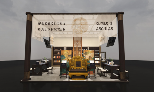 SUPER U的展位顶部悬挂大幅横幅,中央为金色抽象龙形徽标,背景采用米白底色与回字纹边框。这一设计看似传统,实则经过精心调校: