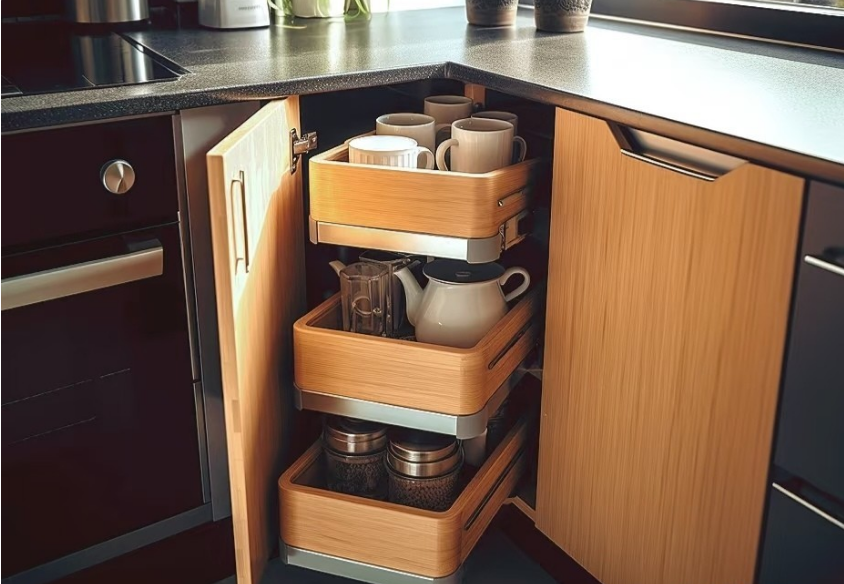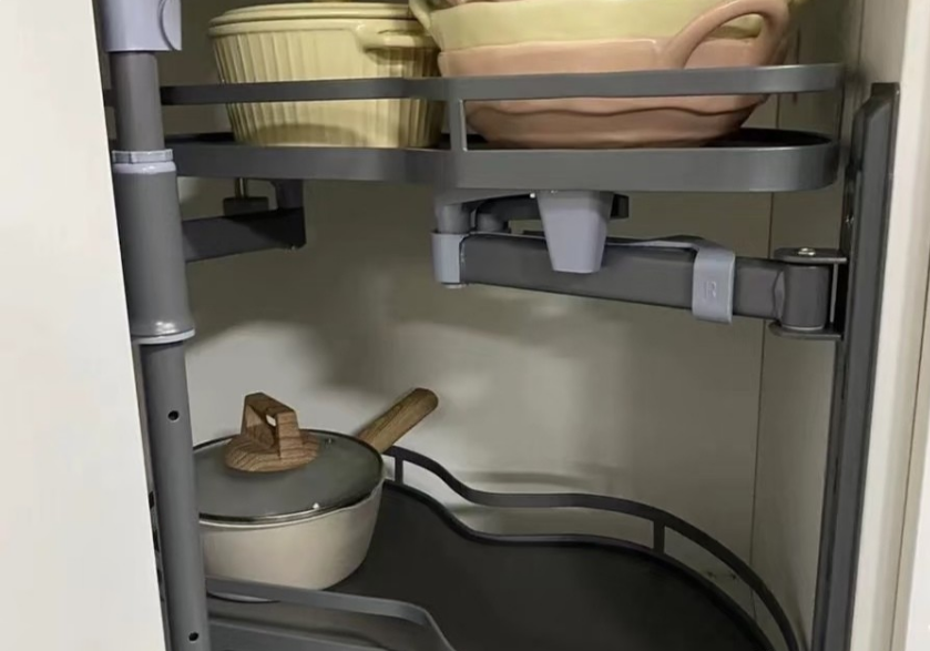 装修建议:厨房转角拉篮,一定要选择质量好的五金,承重也要足够。
