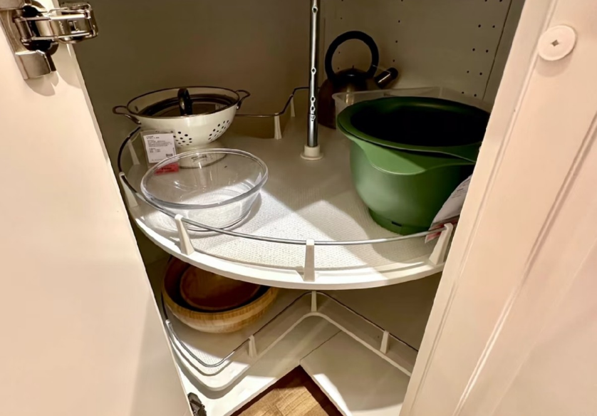 有一个装修细节,就是在厨房转角的位置,可以放弃传统的隔板,取而代之的是安装一个旋转拉篮系统。