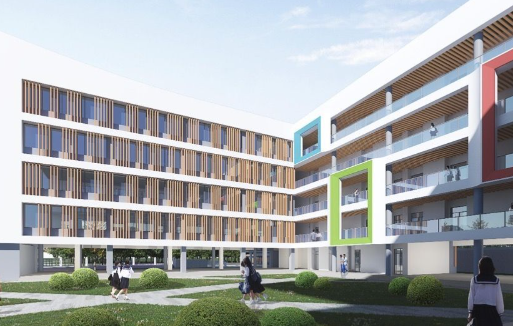 总建筑面积约为30652平方米,其中包含实验楼、行政楼、教学楼、图书馆、阶梯教室、食堂、室内体育馆、学生宿舍、艺术教室、架空活动空间、地下室、运动场及相关配套设施。