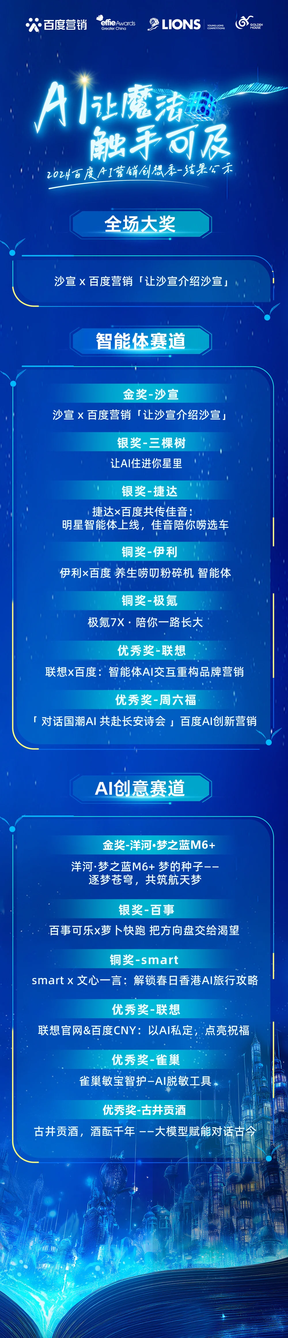 值得一提的是,今年百度营销还联手艾菲中国、戛纳幼狮、金鼠标三大权威赛事,聚焦生成式AI,打造AI创意赛道和智能体赛道,开拓性地设立了全场大奖PK环节,实现赛事的多维升级,为参赛者提供了广阔的展示舞台。