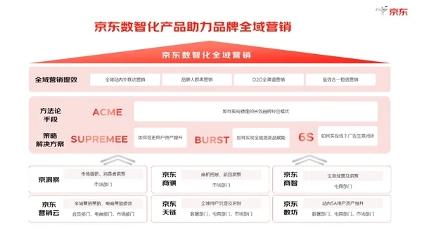 助力品牌全域营销,京东推出了京洞察、京东营销云、京东商骐、京东天链、京东商智、京东数坊等数智化产品,从全域站内外联动营销、品牌人群再营销、O2O全渠道营销、品效合一短信营销等多个维度串联全域通路、击穿品牌困境。