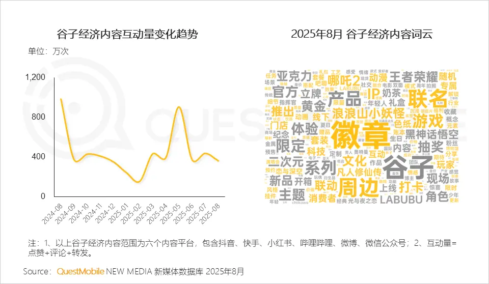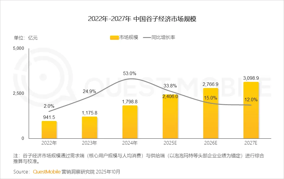 10月14日消息,QuestMobile数据显示,制造产业链愈发成熟、数字基础设施深入生活以及年轻用户走上消费舞台,共同刺激了“谷子经济”持续火爆,预计2025年市场规模将突破2400亿元,并在2027年突破3000亿元大关,而2025年8月,全网用户关注度Top5的谷子IP分别为浪浪山小妖怪、王者荣耀、LABUBU、黑神话悟空、哪吒2。