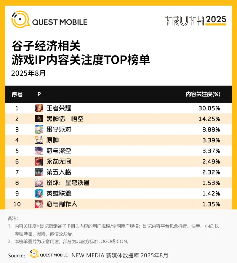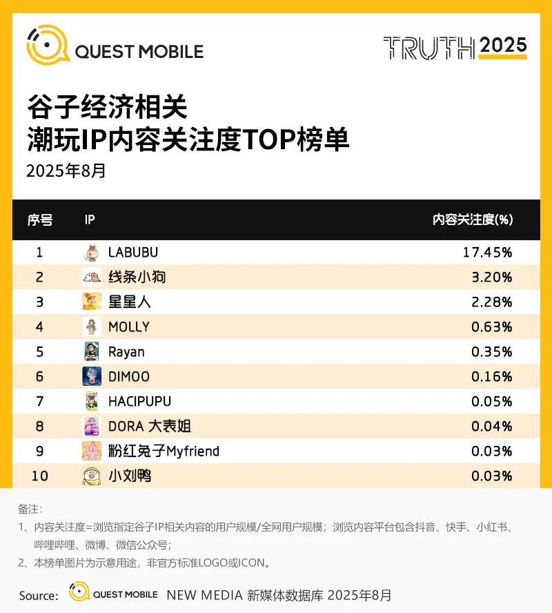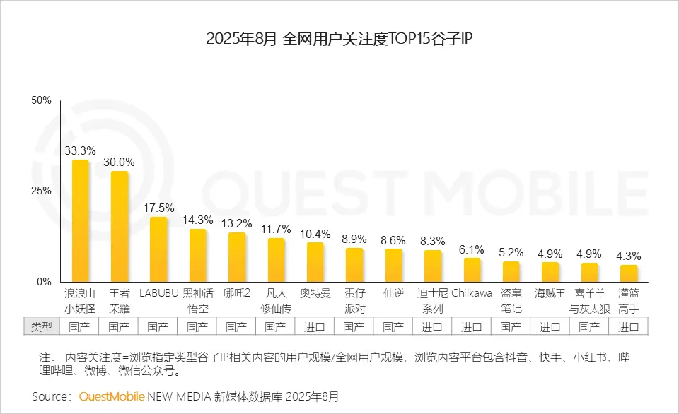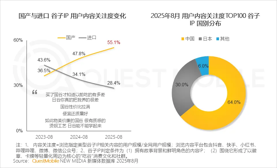 QuestMobile数据显示,随着时间推移,国产谷子IP内容关注度逐渐超越进口,2025年8月全网用户对国产谷子IP的关注度高达55.1%,高出进口谷子IP 26.7个百分点。