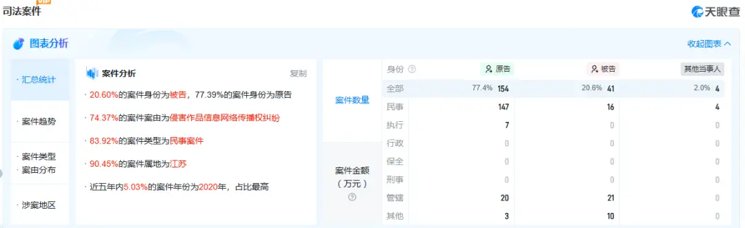雷达财经注意到,截至目前,视觉中国在天眼查上共有司法案件199条,其中作为原告154条,且74.37%的案件案由为侵害作品信息网络传播权纠纷。