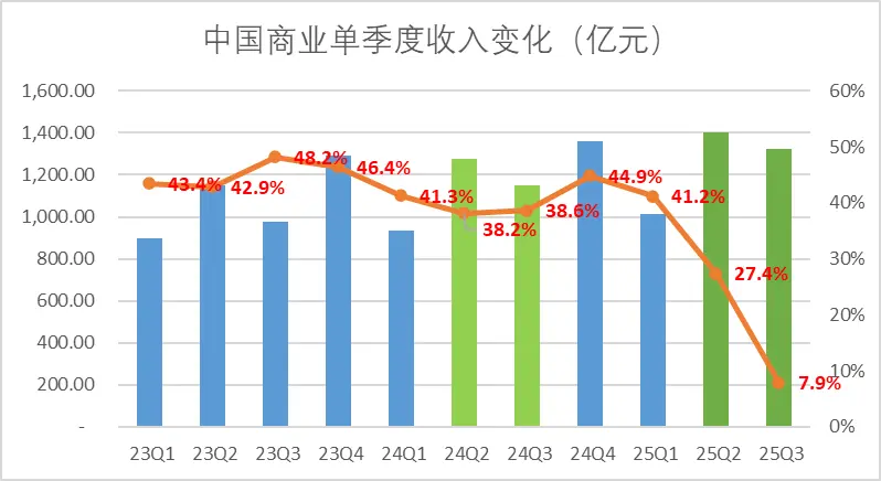 集团三季度Non-GAAP利润仅为103.5亿元,较市场原本已相对保守的预期整整低了65亿元,其核心拖累正是即时零售业务的亏损远超预期。仅从单季度利润变动来看,中国商业板块的净利润收缩了338亿元。