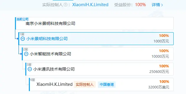 天眼查信息显示,南京小米景明科技有限公司为小米景明科技有限公司全资子公司,均成立于2023年,股权穿透后,二者的实际控制人为XiaomiH.K.Limited。