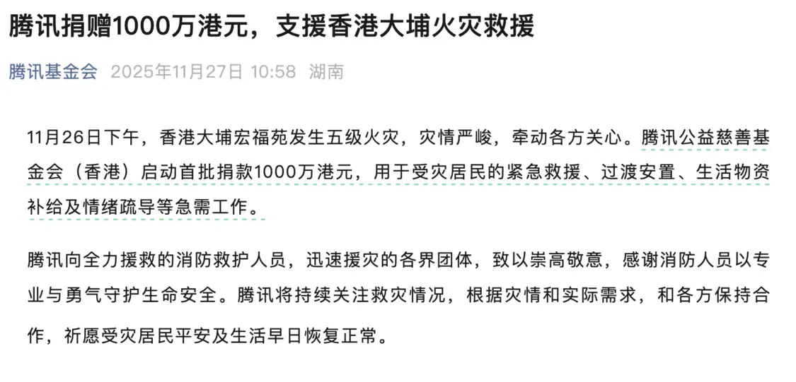据“腾讯基金会”官微消息,腾讯公益慈善基金会(香港)启动首批捐款1000万港元,用于香港大埔火灾受灾居民的紧急救援、过渡安置、生活物资补给及情绪疏导等急需工作。