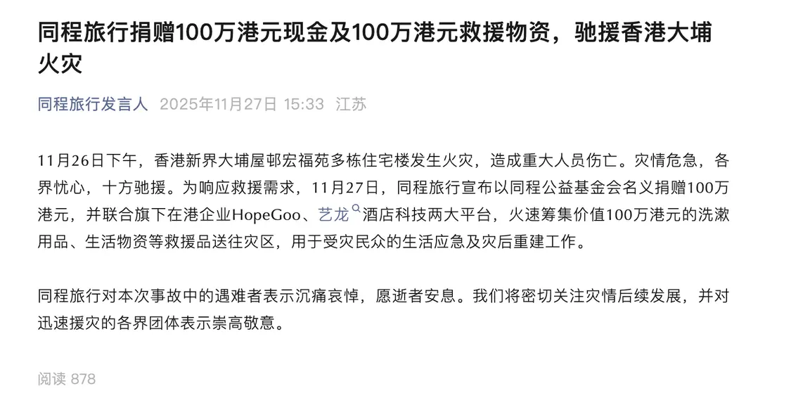 同程旅行捐赠100万港元现金及100万港元救援物资,驰援香港大埔火灾
