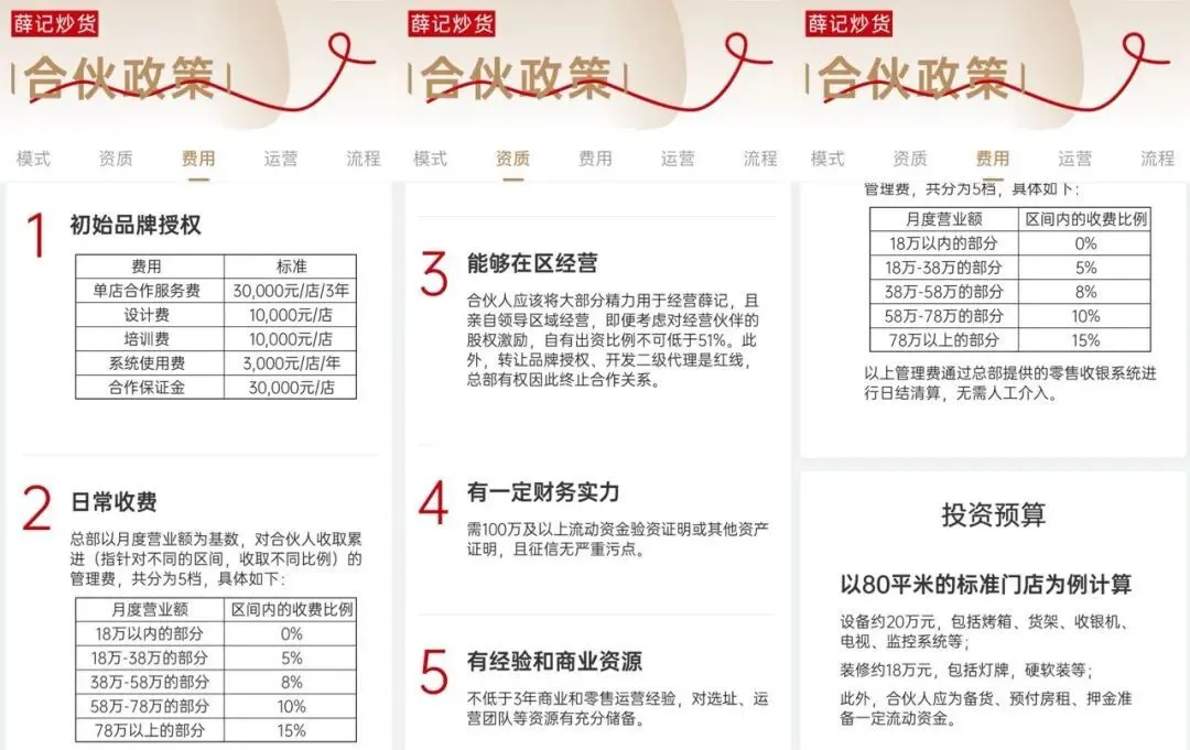 早在2024年2月时,薛记炒货就首次公开招募合伙人,向合伙人开放山东、安徽、江西、广东、福建、广西、海南市场,这些市场多数是之前薛记炒货直营店未涉足的区域。但薛记炒货的加盟门槛并不低。以80平方米标准门店为例,设备费约20万元,包括烤箱、货架、收银机、电视、监控系统等;装修费约18万元,服务费3万,设计、培训、合作保证金等合计为5万元。