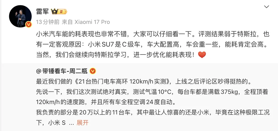 雷军回应小米汽车能耗评测弱于特斯拉:车大配置高