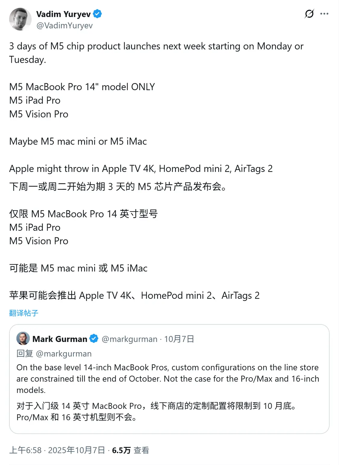 10 月 11 日消息,消息源 Vadim Yuryev 于 10 月 7 日在 X 平台发布推文,报道称苹果公司将于下周一或下周二启动新品发布,为期 3 天时间,主角是 M5 芯片 MacBook Pro 14 英寸型号,还可能推出 Apple TV 4K、HomePod mini 2、AirTags 2 等新品。