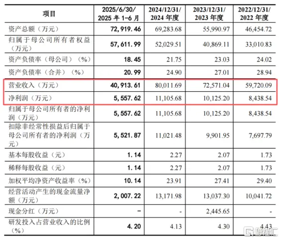 2022年、2023年、2024年、2025年1-6月(报告期),天溯计量的营业收入分别为5.97亿元、7.26亿元、8亿元、4.09亿元,净利润分别为8438.54万元、1.01亿元、1.11亿元和5557.62万元。