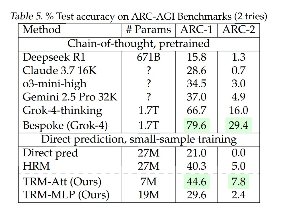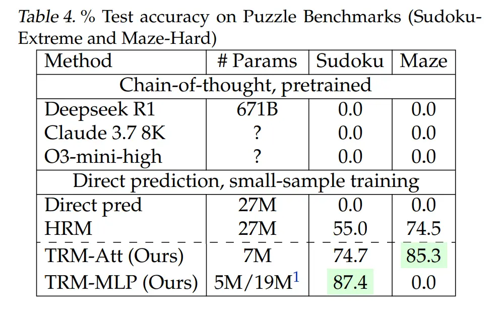 尽管模型极小,TRM 在多个基准测试中展现了“以小博大”的惊人实力: