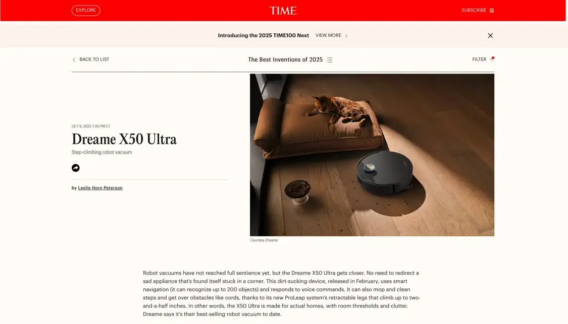 《时代周刊》年度发明评选关注产品的技术创新性、性能表现及行业影响力。此次入选标志着追觅X50 Ultra在扫地机器人领域的技术特点获得了国际认可。