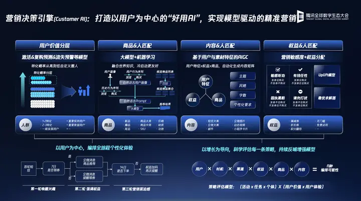 为解决企业面临的“增长焦虑”与“本领焦虑”,腾讯企点推出了“营销决策引擎(Customer AI)”作为整个系统的“大脑”。该引擎的核心是“以用户为中心,编排全旅程个性化体验”。它彻底改变了过去依赖经验的低效策略循环,通过强大的大模型和机器学习能力,为企业提供了清晰、可量化的增长路径。它能够科学地评估每一条策略,并持续将洞察反哺给模型本身,使其不断进化。