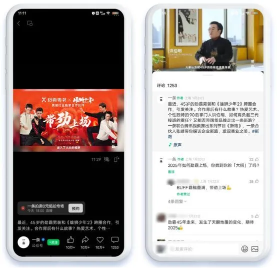 劲霸作为沉淀45年的国货品牌,期待通过内容营销展现品牌升级新形象。依托视频号互选广告的双向互选、精准匹配的优势,劲霸与深度内容创作者“一条”达成合作。结合“一条”自身内容风格与劲霸品牌调性,产出深度对话企业家等内容,自然融入品牌历史文化、与《雄狮少年2》合作契机及品牌未来思考,以原生内容形态有效提升用户接受度和情感共鸣。