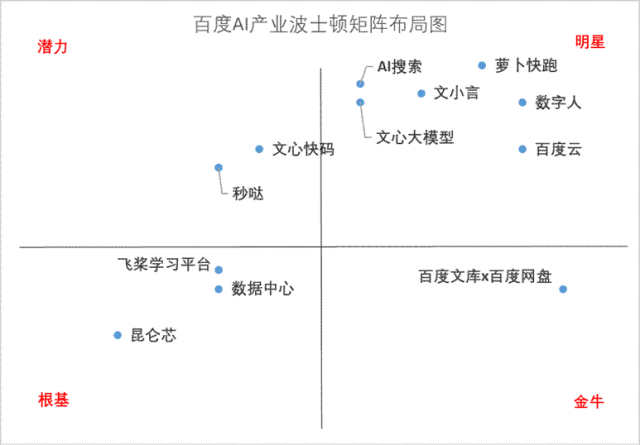 如果我们如以“波士顿增长矩阵”为逻辑,勾勒百度的“大模型生态雨林的涌向效果”,则可一图胜千言般一目了然: