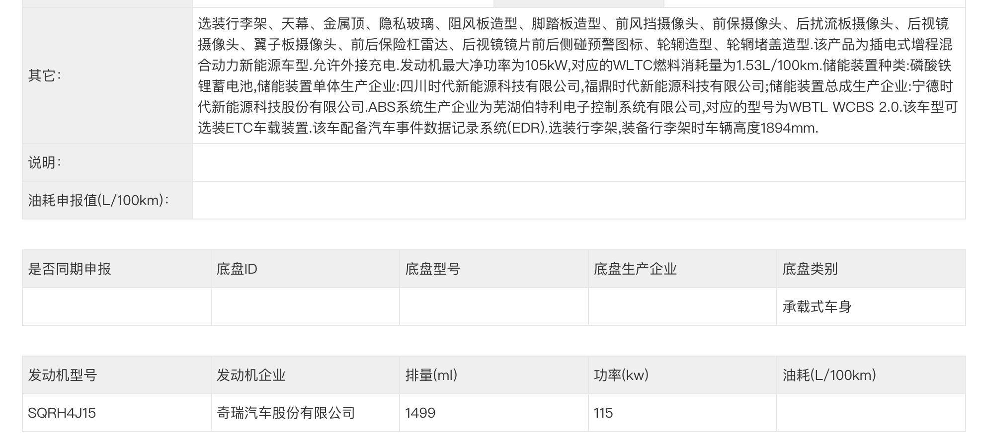 动力总成是1.5T增程,1.5T发动机输出115kW。估计会标配双电机,因为申报目录上没有详细信息,只是考虑到34.3度电的磷酸铁锂电池的WLTC工况纯电续航只有145-150公里,预计双电机概率更大。同时百公里油耗为7L左右,算是一个比较高的油耗。