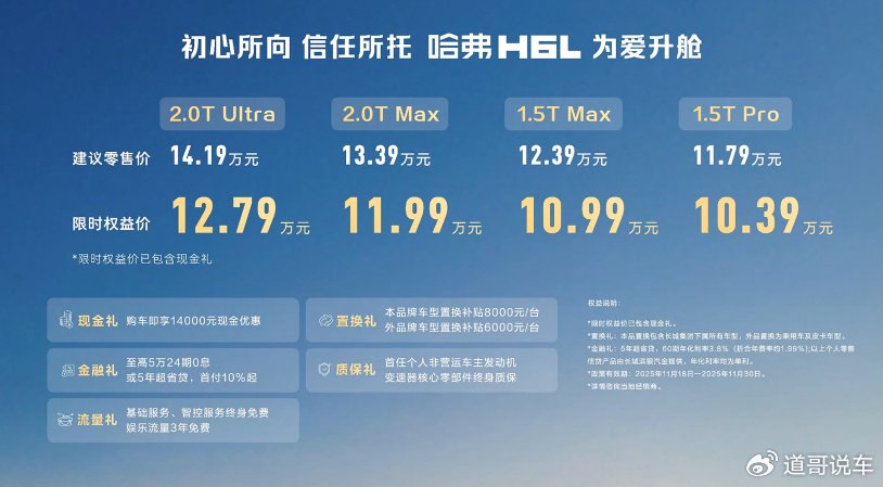 11月18日,哈弗品牌都市品类中型SUV全新力作——哈弗H6L(配置|询价)正式上市。新车共推出4款车型,官方指导价11.79万-14.19万元,限时权益价10.39万-12.79万元。