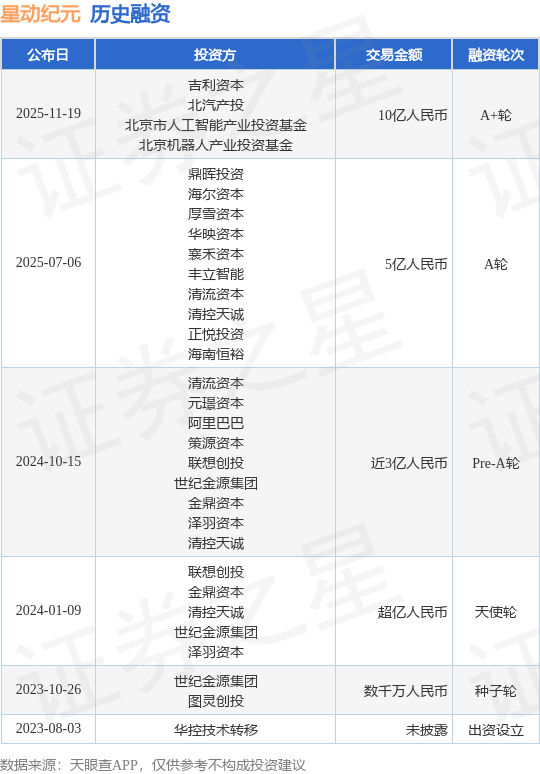 根据天眼查APP于11月19日公布的信息整理,北京星动纪元科技有限公司A+轮融资,融资额10亿人民币,参与投资的机构包括吉利资本,北汽产投,北京市人工智能产业投资基金,北京机器人产业投资基金。