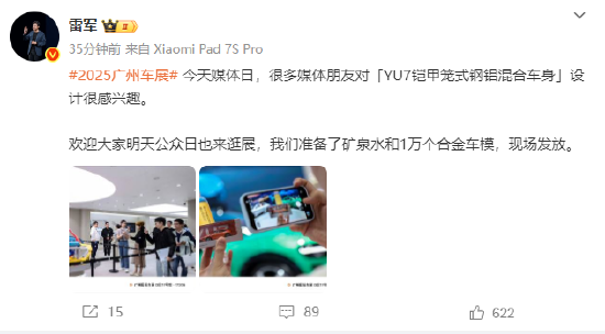雷军:欢迎大家逛广州车展,小米展台将发放矿泉水和1万个合金车模