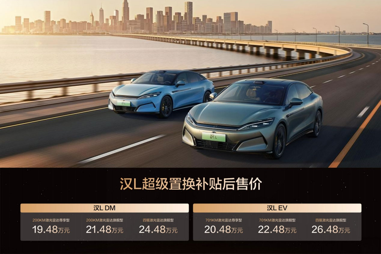 汉L DM把价格拉进了20万内,3个版本超级置换补贴后售价分别是19.48万元、21.48万元、24.48万元,2个200km前驱版,1个解耦智能电四驱版本,共计3个配置可选。