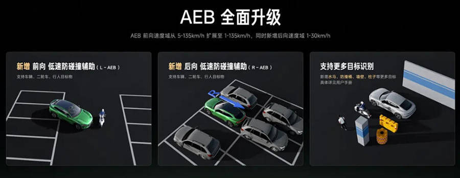 得益于低速防碰撞功能的加入,AEB系统的工作速度范围得到显著扩展。前向防护范围从原来的5-135km/h提升至1-135km/h,后向防护则覆盖1-30km/h。系统还新增了对墙壁、立柱、防撞桶等静态障碍物的识别能力,进一步增强了复杂环境下的安全保障。在实际使用场景中,该系统可在拥堵路段跟车、倒车入库、低速转弯以及路口通行时,主动识别风险并采取预防措施。