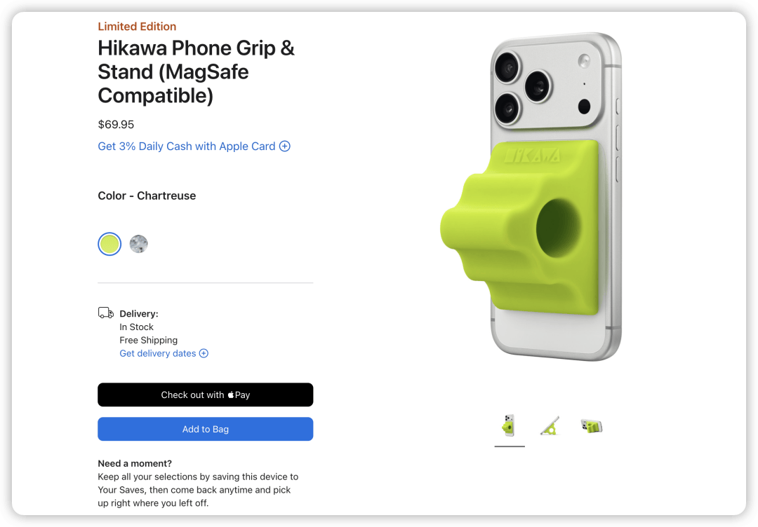 Hikawa 支架共有两种配色可选,分别是醒目的高亮黄绿色、以及苹果独家发售的再生玻璃色。