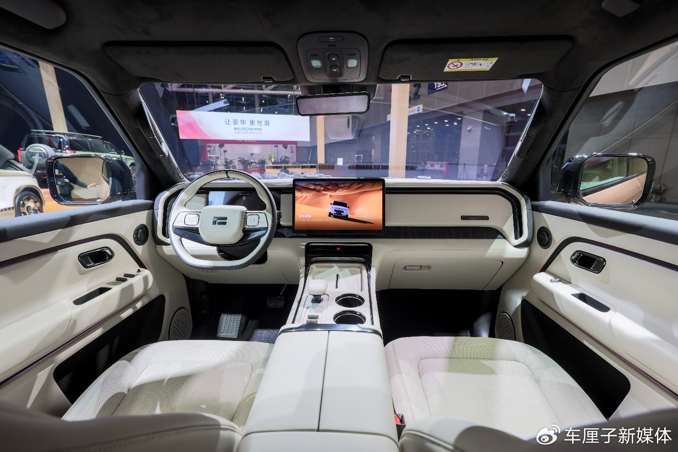 在一众展车中,极石ADAMAS Royal Edition皇家定制版颇受关注:金属粉白与哑光金双色车身,搭配专属轮毂与悬浮LOGO,更以一道灵感源于传统“Thobe”服饰的黑色菱形拉花,勾勒出独特的文化身份。内饰则将沙棕与皓白的主色调,与珍稀的沙比利天然球沙木饰板相融;而奢华半苯胺真皮座椅上,配以精美的刺绣,其纹样来自至中东皇室宫殿的菱形格纹,充分融入中东的文化氛围,也显示出定制皇室专属的奢华格调。