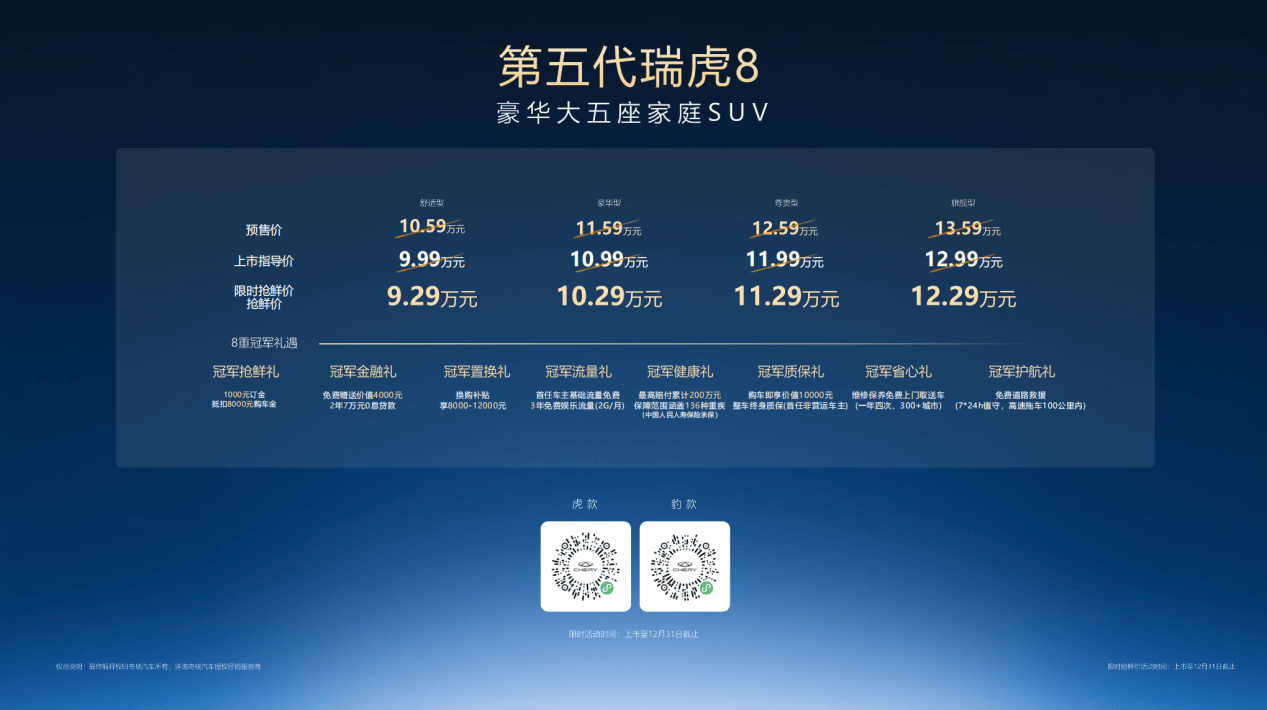 第五代瑞虎8上市限时抢鲜价为9.29万元起,同时还诚意推出8重冠军礼遇,让消费者购车更轻松、用车更省心!