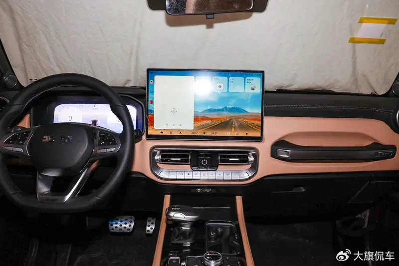 外观看上无奇,但打开车门却内有乾坤。BJ40探险家车内整体布局实际上依旧延续老款BJ40,但在仪表台中央却换装了全新的15.6英寸的悬浮式车机大屏,大屏下方原本圆形的空调出风口以及按键区域也被更换为新款BJ40的同款设计,简单点来说也就是“新老拼接”,但这一套操作实际上对于整车内部的质感以及科技感所带来的改观还是非常明显的。