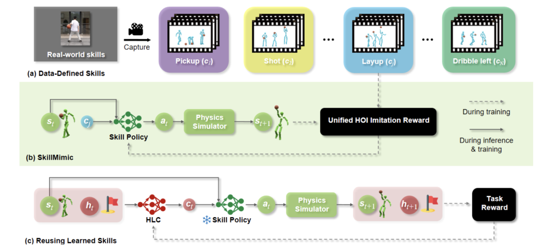 分层学习架构(Hierarchical Solution):低层:交互技能策略(IS Policy):通过SkillMimic框架学习各种基础交互技能(如运球、上篮)。高层:高级控制器(HLC):训练一个高级策略来复用和组合已习得的IS策略,以完成长程复杂任务(如连续得分)。