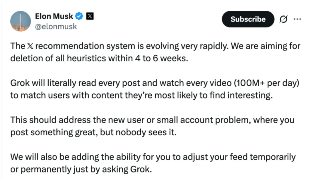 当时老马表示,要在未来几周内彻底移除X启发式推荐算法,由Grok接手,通过阅读和观看全部内容来全自动匹配用户兴趣。