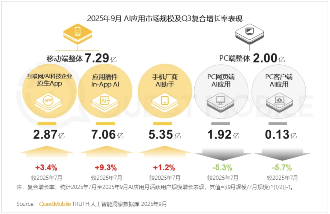 QuestMobile数据显示,2025年9月,AI 原生App、In-App AI及手机厂商AI助手,用户规模分别达2.87亿、7.06亿和5.35亿。其中,月活跃用户规模TOP 50的AI应用中,In-App形态的插件应用占到31个,可谓遥遥领先。