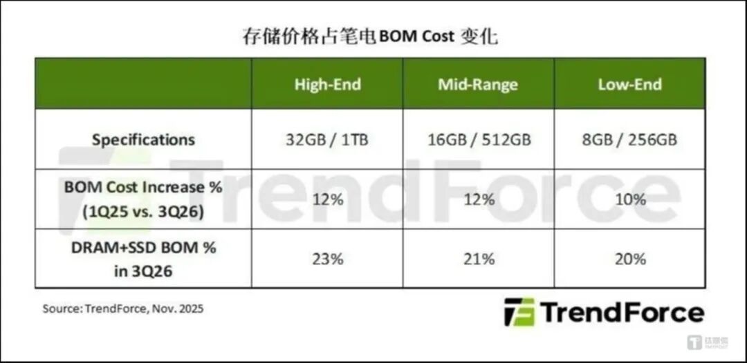 2026年笔电市场同样将面临明显压力,DRAM及NAND Flash合计占笔电整机BOM cost的比重约10~18%,在如此大幅且连续数季的上涨下,预估存储器占整机BOM cost的比重将进一步扩大至20%以上。若品牌选择将成本转嫁,预估2026年笔电终端售价将普遍上调5~15%。