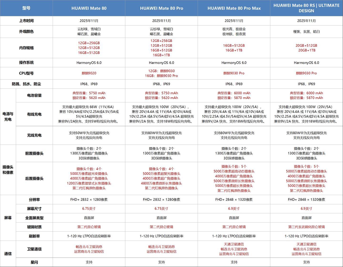 IT之家汇总华为 Mate 80 系列手机重点参数配置差异如下: