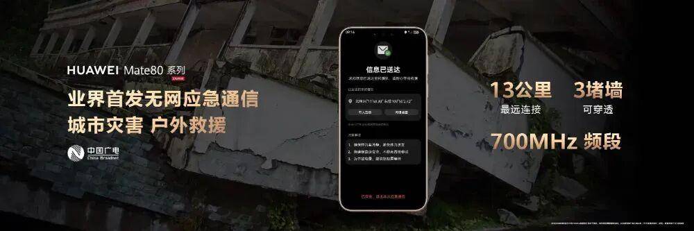 为什么是700MHz无网应急通信?众所周知,700MHz具有传播损耗低、覆盖广、穿透能力强等特点,一直被业内视为黄金频段。此外,700MHz还适配“三断”救援场景,且能与便携、空中应急基站协同,兼顾功耗与终端集成。据余承东介绍,Mate80系列所搭载的700MHz无网应急通信,可在地震、洪水或野外失联等断网险情下搭建生命通道,信号覆盖半径超过13公里,可穿透3堵墙。