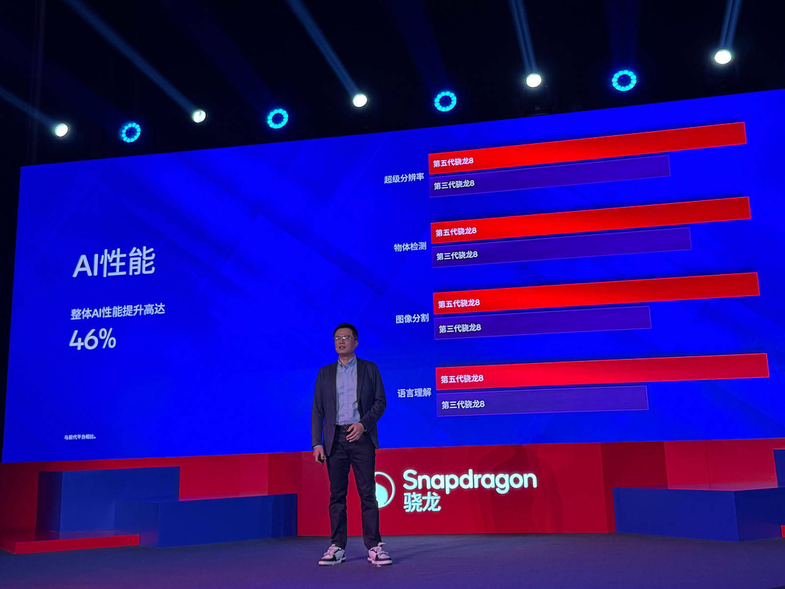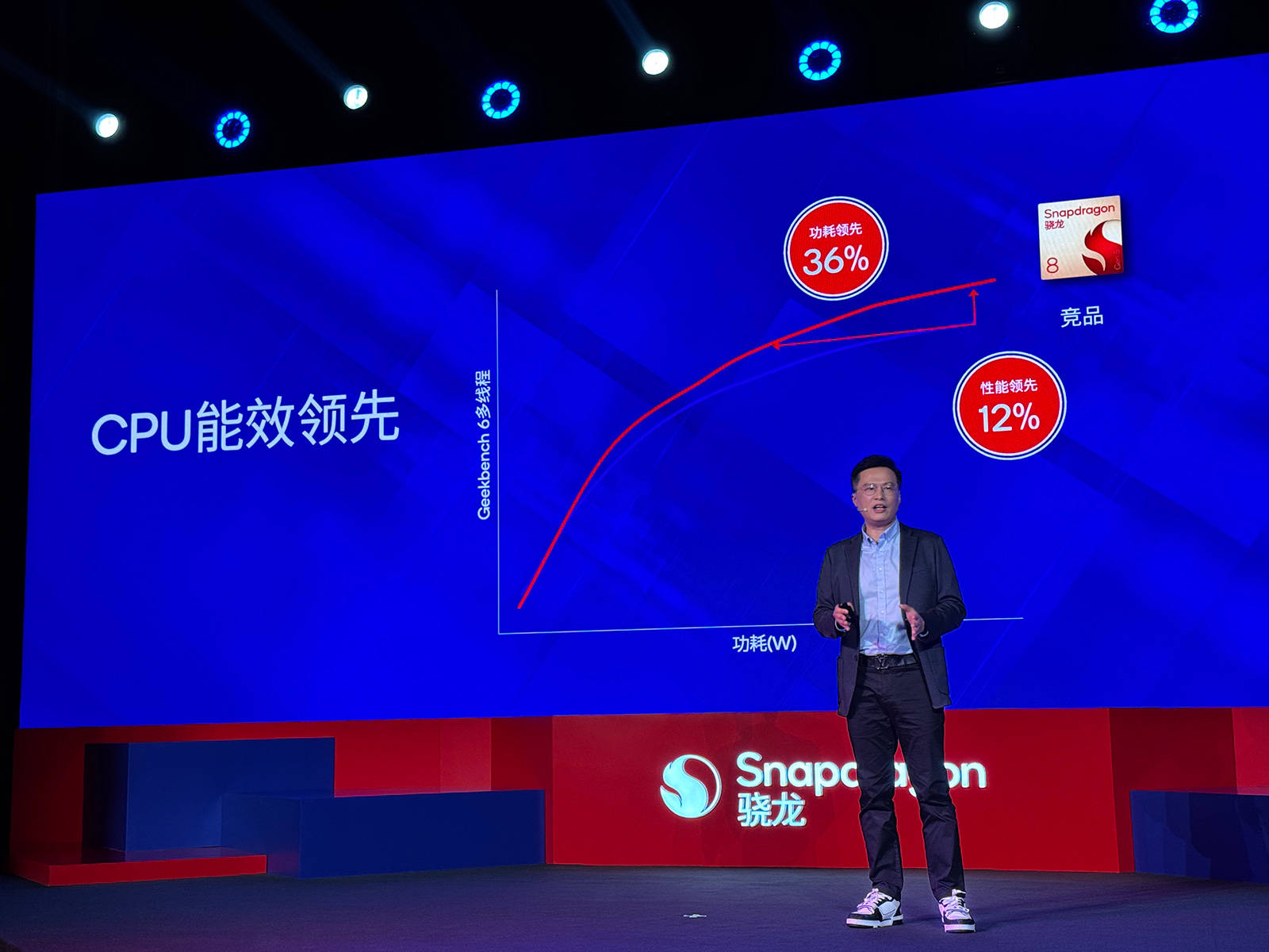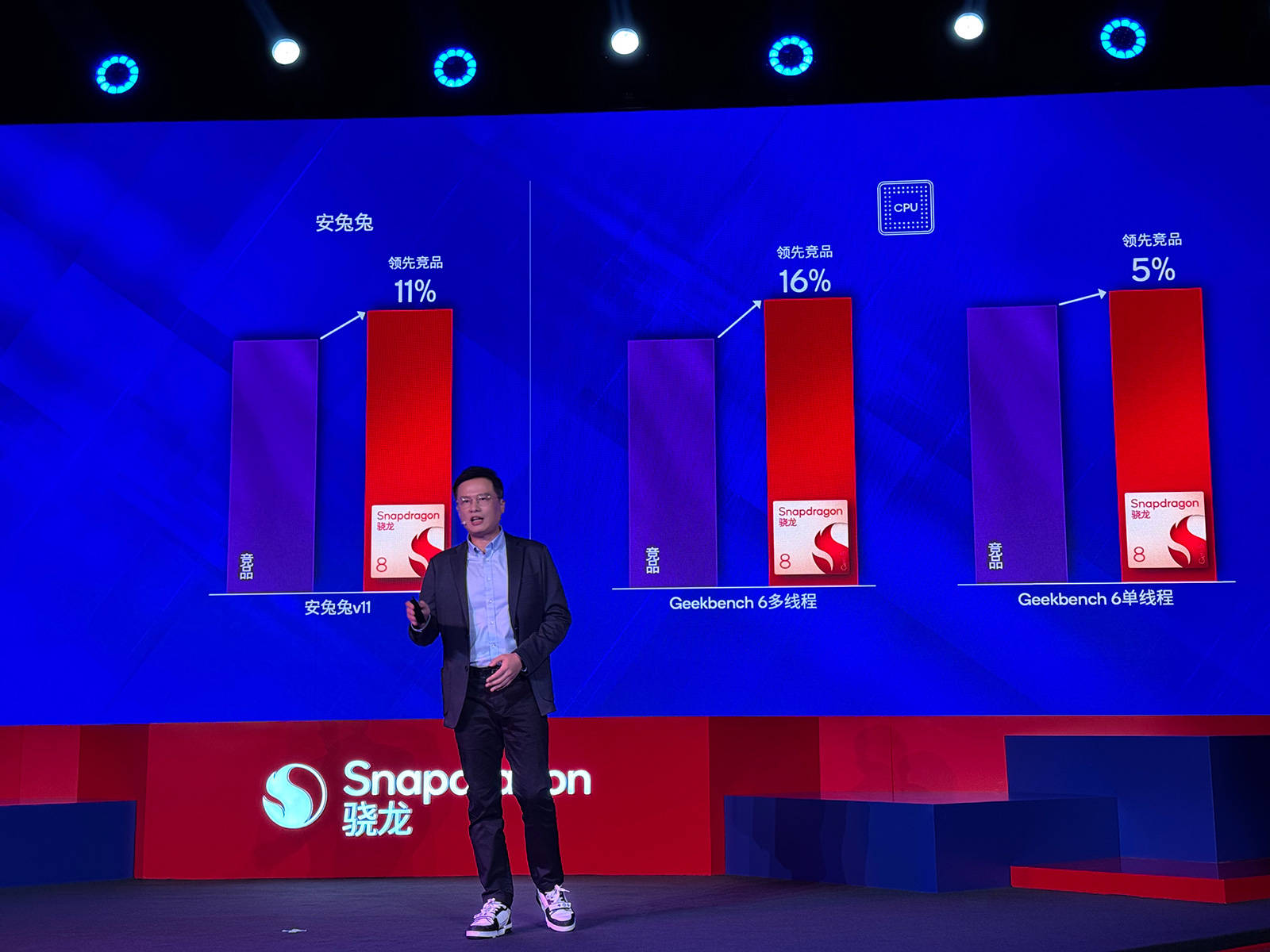 高通技术公司产品市场高级总监马晓民表示,相比竞品,第五代骁龙移动平台运行安兔兔v11的跑分领先11%,在Geekbench测试中,CPU多核表现领先16%,多核领先5%,并且能效也有更优秀的成绩。