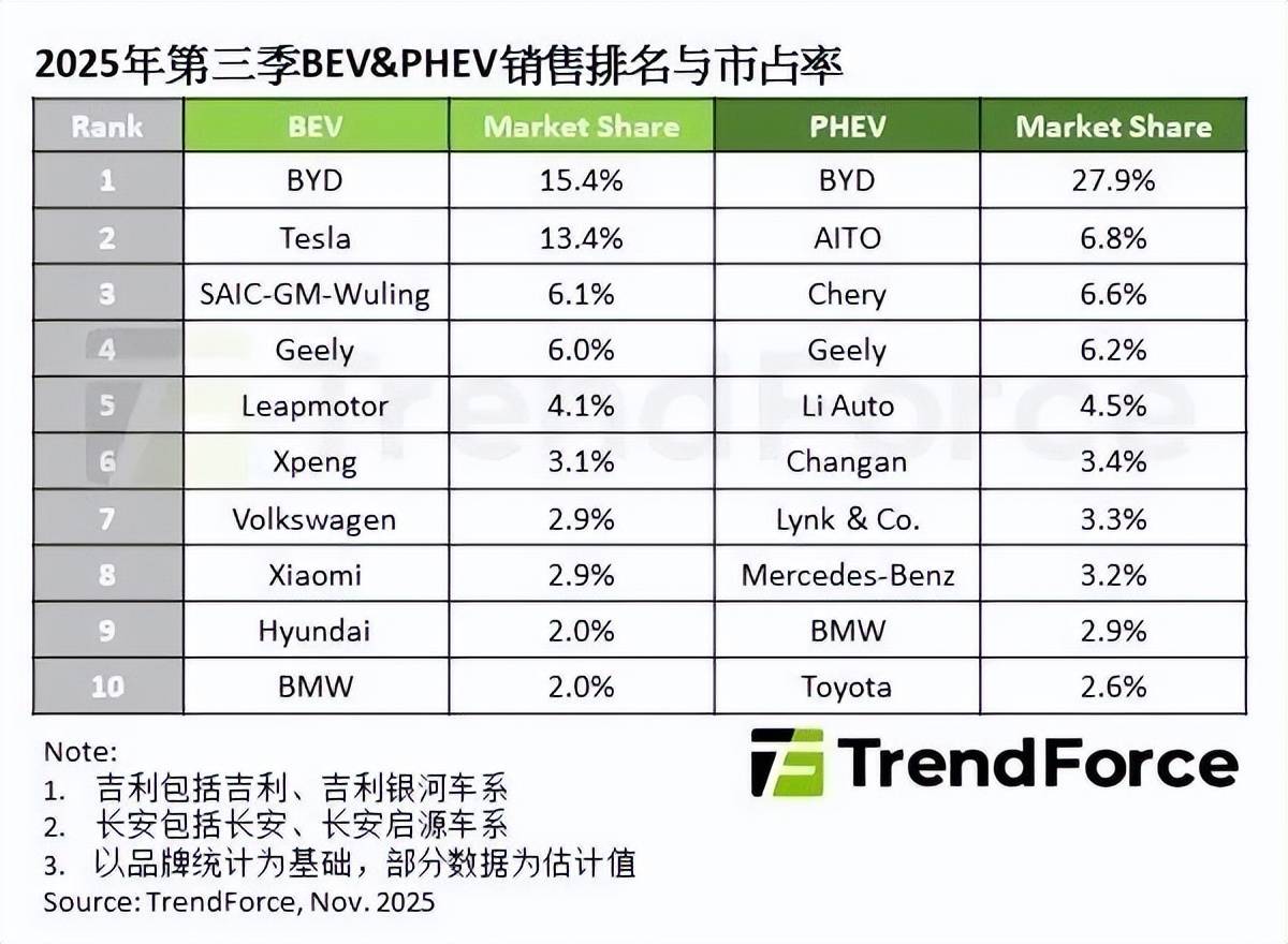 如下图所示,这是2025年三季度的数据,分为BEV(纯电)、PHEV(插混)两个类别。