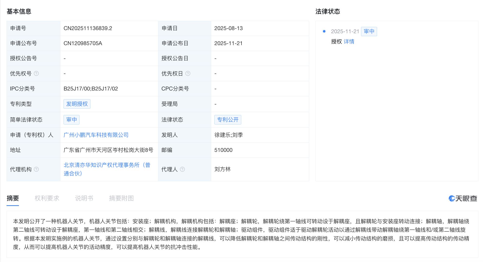 11月26日,天眼查显示,近日,广州小鹏汽车科技有限公司申请的“机器人关节”专利获授权。