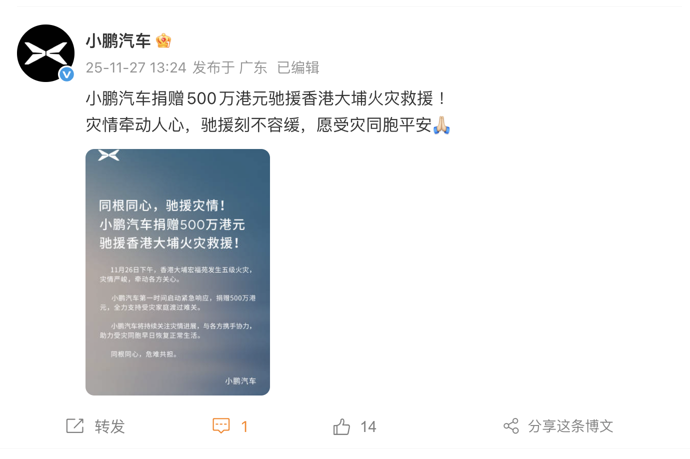 小鹏汽车捐赠500万港元 驰援香港大埔火灾救援