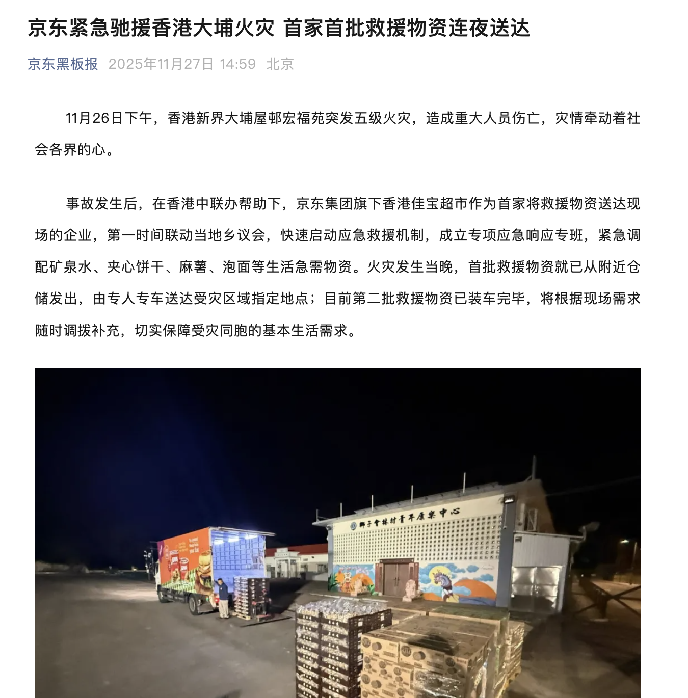 京东紧急驰援香港大埔火灾 首批救援物资当晚从附近仓储发出