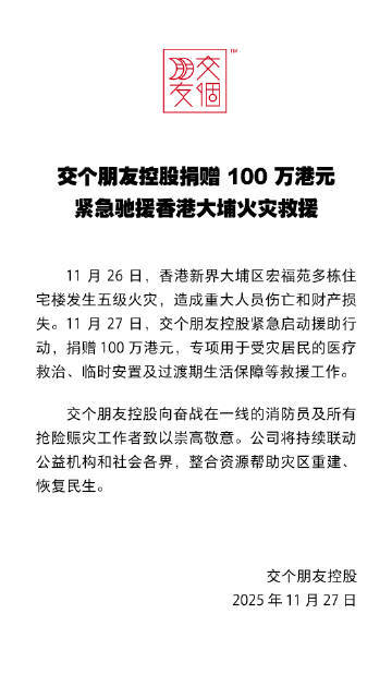 11月27日,交个朋友控股紧急启动援助行动,捐赠100万港元,专项用于受灾居民的医疗救治、临时安置及过渡期生活保障等救援工作。